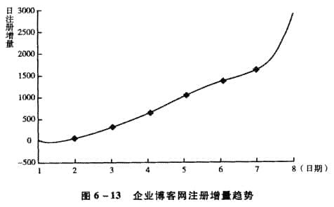 通過采集到的從企業博客問世起前兩個月注冊用戶的日增長量作為數據。選擇7個點用M atlab作出一條企業博客網注冊用戶增長趨勢曲線(見圖6一13),可以更直觀地看到企業博客網注冊用戶數量的增長情況。