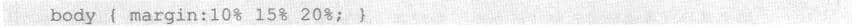 為margin屬性設(shè)置4個屬性值時,其4個屬性值分別定義網(wǎng)頁對象的頂部、右側(cè)、底部和左側(cè)的邊界寬度,其代碼如下所示。