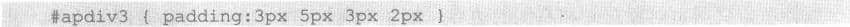 使用不帶復(fù)合屬性的padding屬性也可以為網(wǎng)頁對象設(shè)置4邊不同的填充值。其方法是為padding屬性設(shè)置多個屬性值.為padding屬性設(shè)置兩個屬性值時,其第l個屬性值定義網(wǎng)頁對象頂部和底部的填充,而第2個屬性值定義網(wǎng)頁對象左側(cè)和右側(cè)的填充,其代碼如下所示。