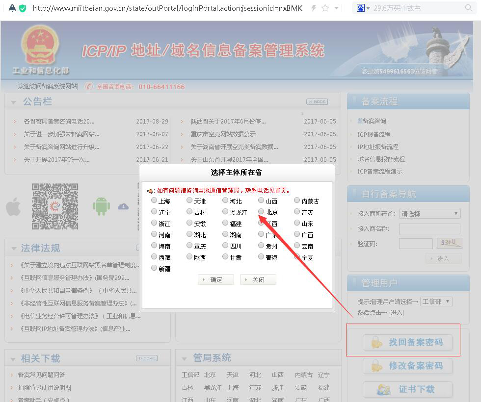 打開工信部網址后  點擊頁面左下角 找回備案密碼 選擇自己公司備案所在的省份(這里列舉北京市)