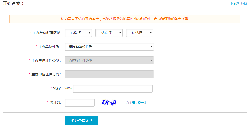 2. 完成主體信息及備案域名的填寫,并驗證備案類型。