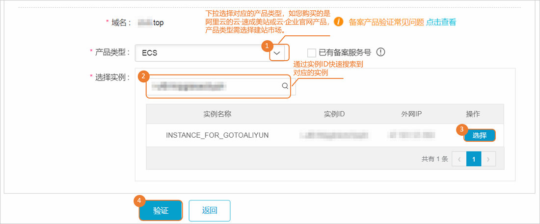 如果您備案的服務(wù)器在當(dāng)前登錄的阿里云賬號(hào)下,您可直接選擇當(dāng)前阿里云賬號(hào)下的云服務(wù)器實(shí)例進(jìn)行產(chǎn)品驗(yàn)證。備案時(shí)系統(tǒng)會(huì)自動(dòng)生成和關(guān)聯(lián)備案服務(wù)號(hào),您無(wú)需手動(dòng)申請(qǐng)備案服務(wù)號(hào)。