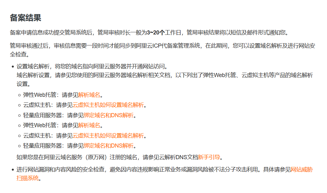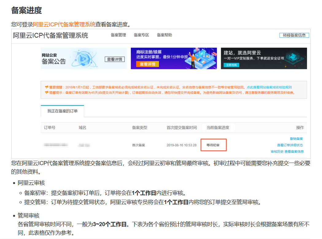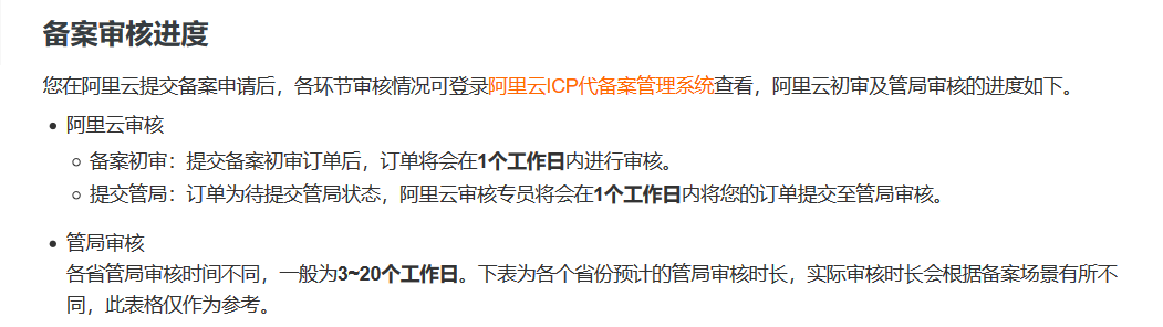 備案申請(qǐng)信息成功提交至管局系統(tǒng)后,管局審核一般為3~20個(gè)工作日,您可以隨時(shí)登錄阿里云ICP代備案管理系統(tǒng)查看備案進(jìn)度。