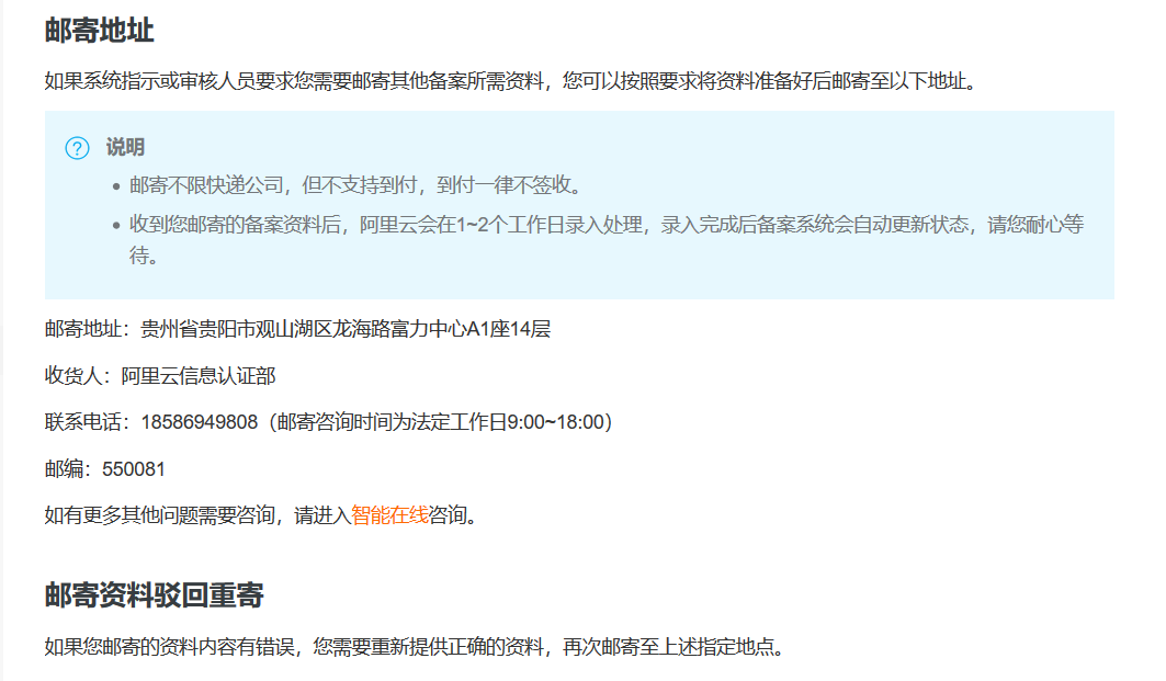 阿里云在進(jìn)行備案信息初審過(guò)程中,根據(jù)您提交的資料及各地管局的要求,有可能需要您按照系統(tǒng)指示郵寄資料至指定地點(diǎn)。
