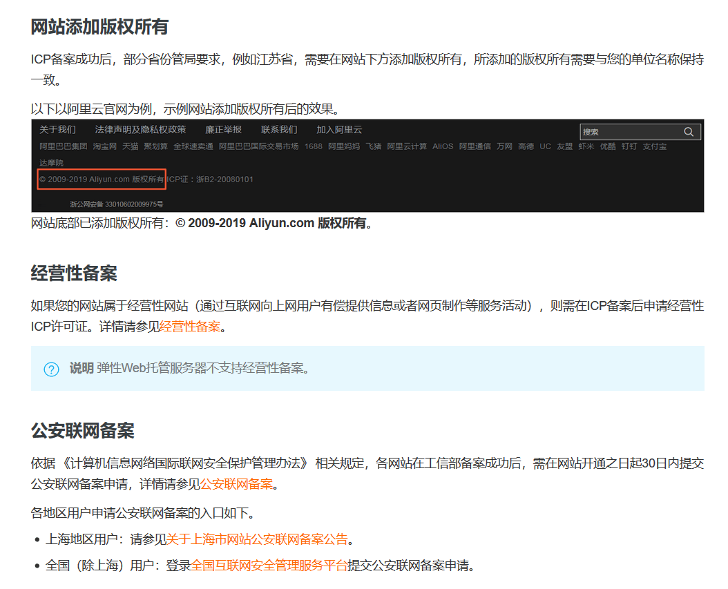 ICP備案成功后,您需要在網(wǎng)站底部添加備案號(hào)并鏈接至工信部網(wǎng)站。部分省份還要求在網(wǎng)站底部添加版權(quán)所有。若網(wǎng)站涉及經(jīng)營(yíng)性業(yè)務(wù),您需在ICP備案后申請(qǐng)經(jīng)營(yíng)性ICP許可證。待各網(wǎng)站在工信部備案成功后,需在網(wǎng)站開(kāi)通之日起30日內(nèi)提交公安聯(lián)網(wǎng)備案申請(qǐng)。