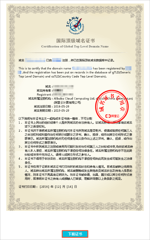 域名注冊商非阿里云:請聯系您的域名注冊商獲取。本文以阿里云注冊的域名為例,示例您如何下載域名證書,如需下載其他域名注冊商的域名證書,請聯系您的域名注冊商。