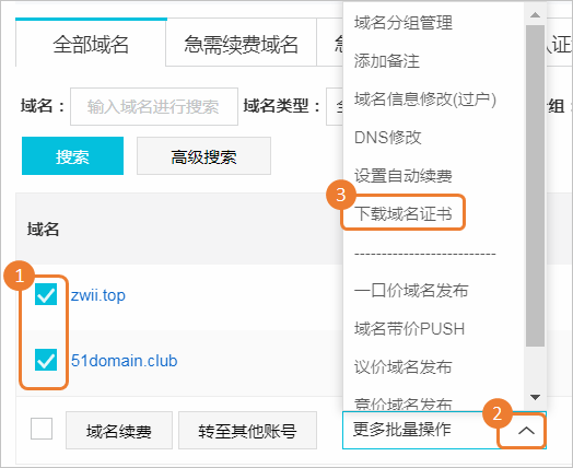 - 在域名列表頁面,批量勾選待下載域名證書的域名,單擊更多批量操作,在下拉框中選擇下載域名證書。