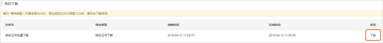 - 在我的下載頁面,找到導出的域名證書,單擊下載后可下載到電腦本地。