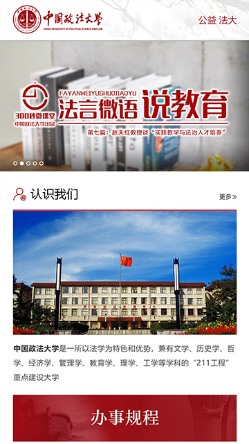 法大人的公益文化傳播平臺,秉承“聚法大智慧,譜公益人生,倡法治文明,揚慈善精神”的工作理念。H5交互設計 高校手機端